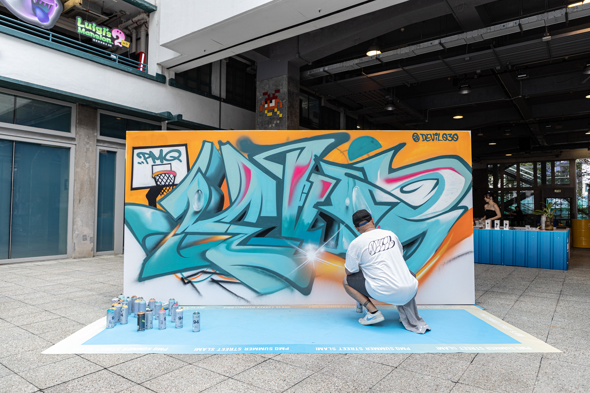 參與 PMQ 盛夏街場Summer Street Slam的創作部分,當中包括 Event graffiti logo design, 場內親筆畫布作品和 event live painting。